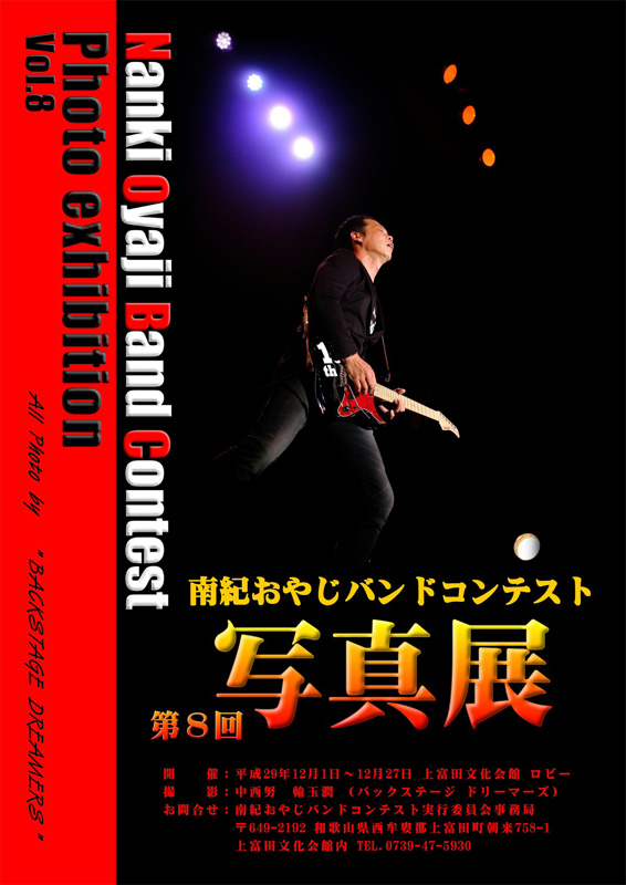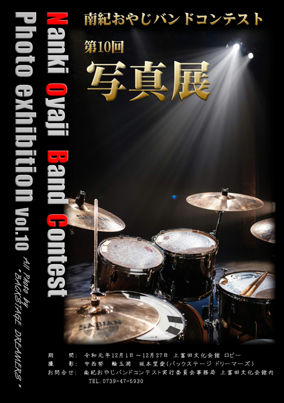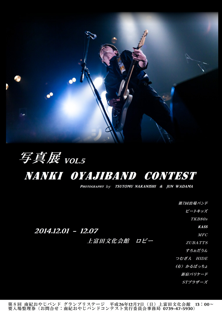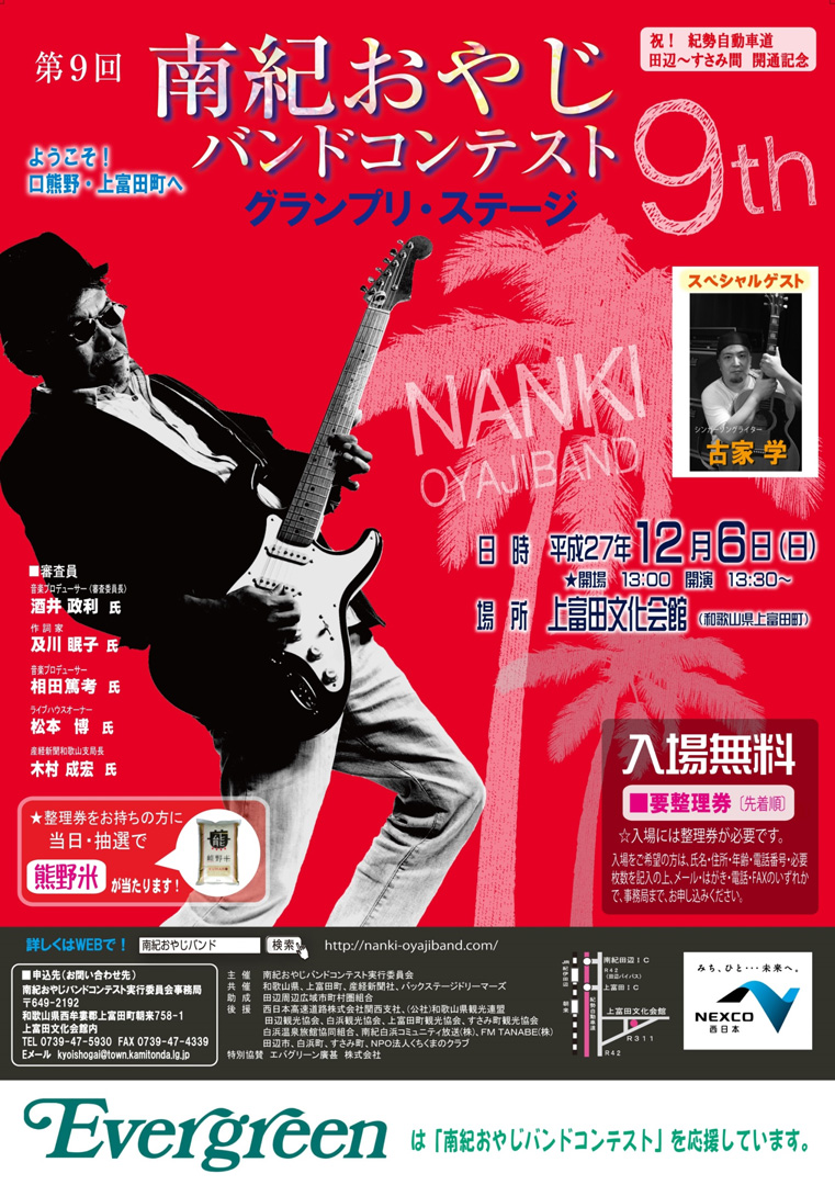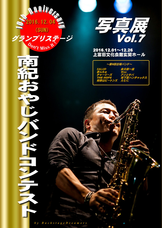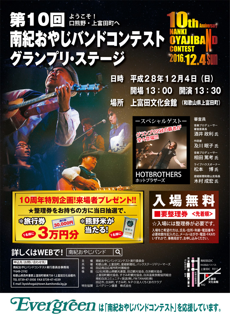 今年は群馬県太田市から初出場の「はまばん」の皆様が見事グランプリを受賞されました。他の賞は以下のとおりです。受賞されたみなさま、おめでとうございます!□グランプリ はまばん 【群馬県太田市】 ■ベストオリジナル賞 服部バンド 【和歌山県有田川町】 ■エバグリーンベストカバー賞 地味メタボリX 【大阪市浪速区】 ■上富田町長賞 THE olive-crown 【和歌山県海南市】 ■南紀賞 THE YEBISU 【東京都中央区】 ■産経新聞社賞 THE POWER STONES 【和歌山県橋本市】 ※詳細はこちら。また、ブログでも随時紹介いたします。